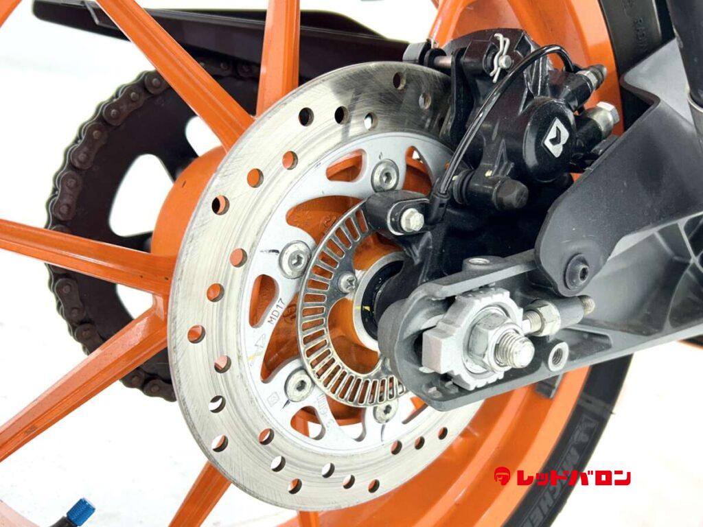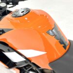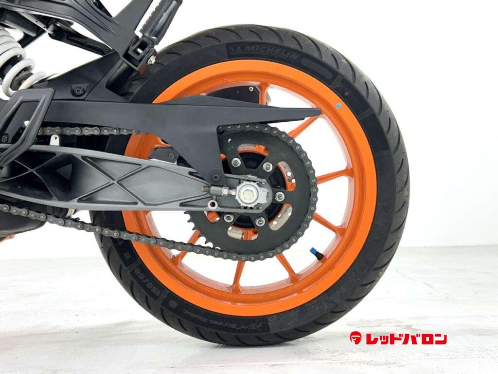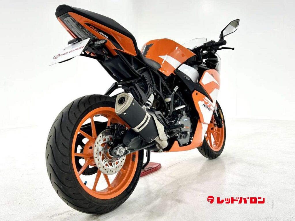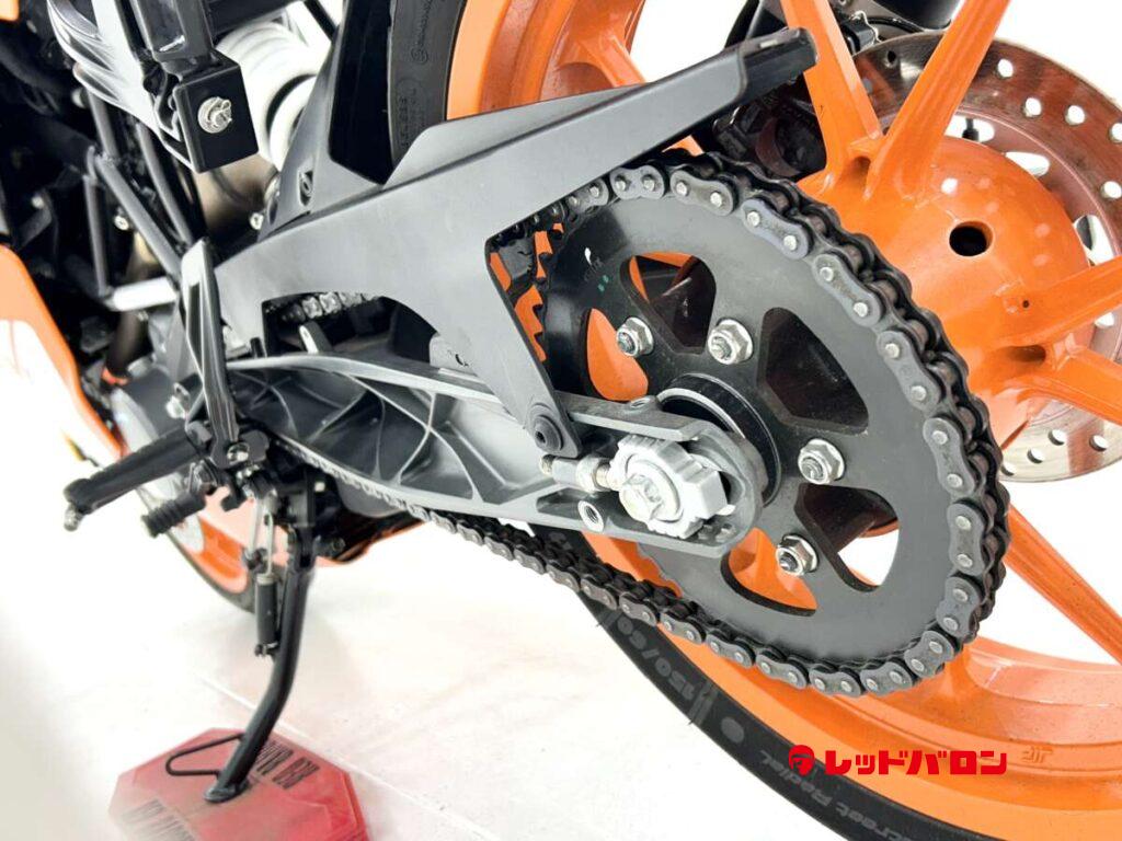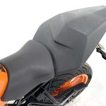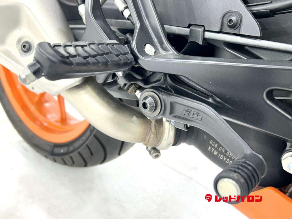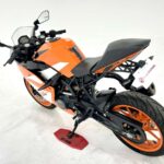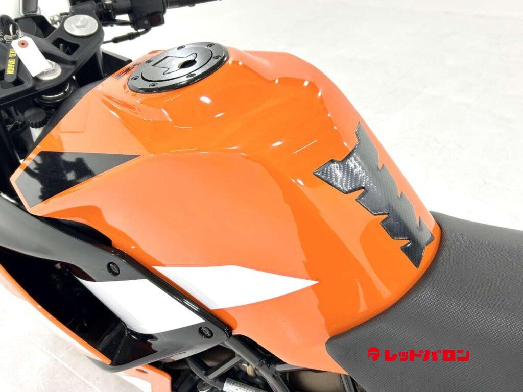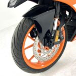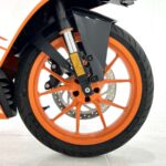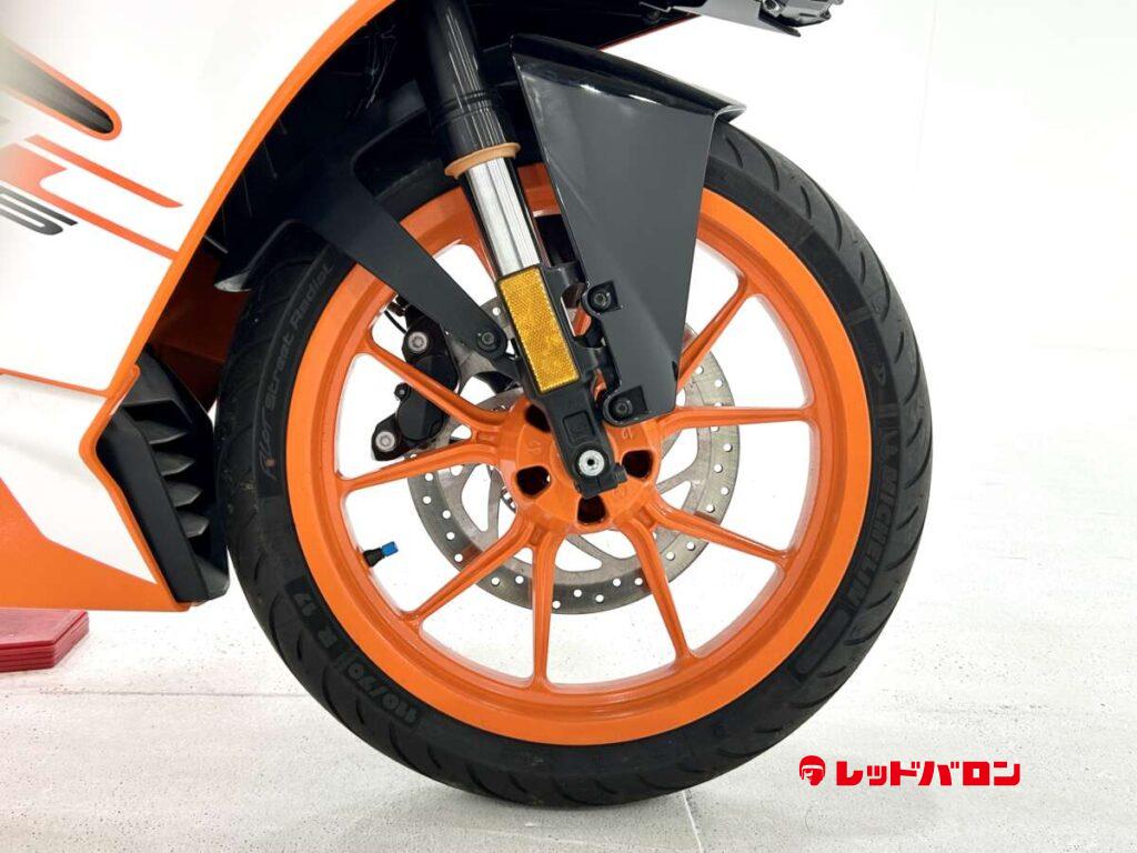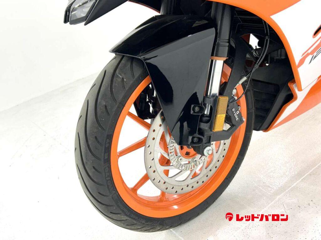 125デュークに比べてホイールベースが短く、更にフロントには倒立フォークを装備している一台です